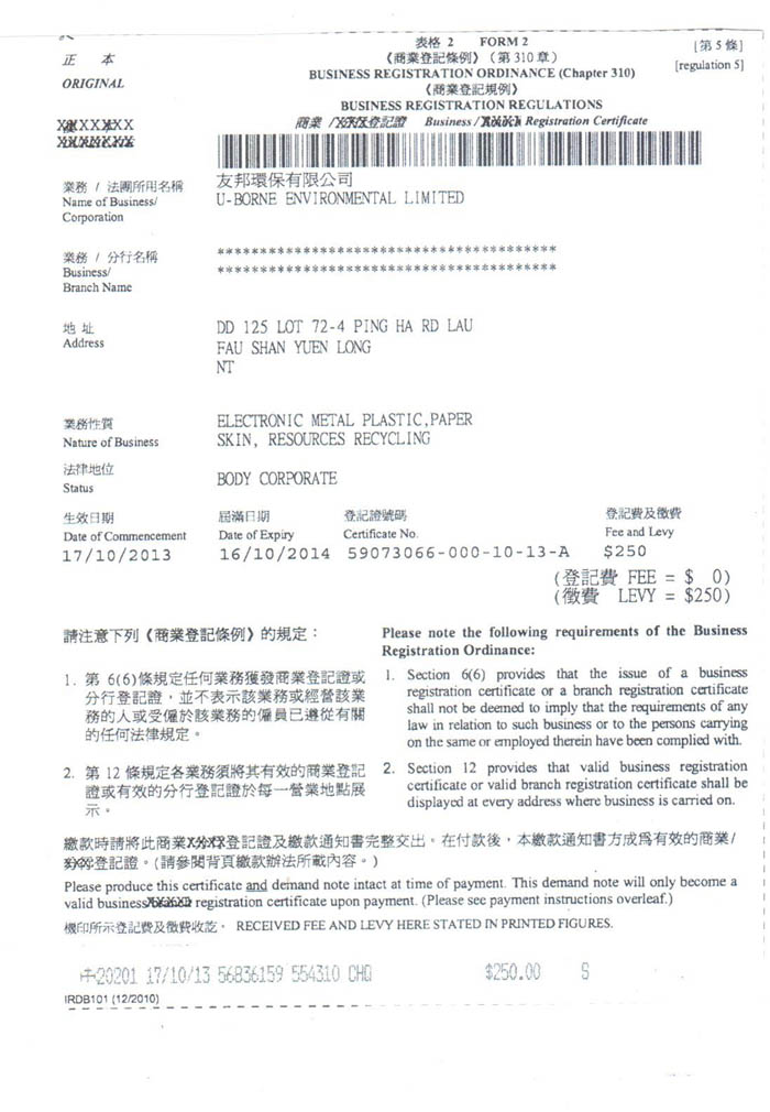 友邦-废物产生者登记证