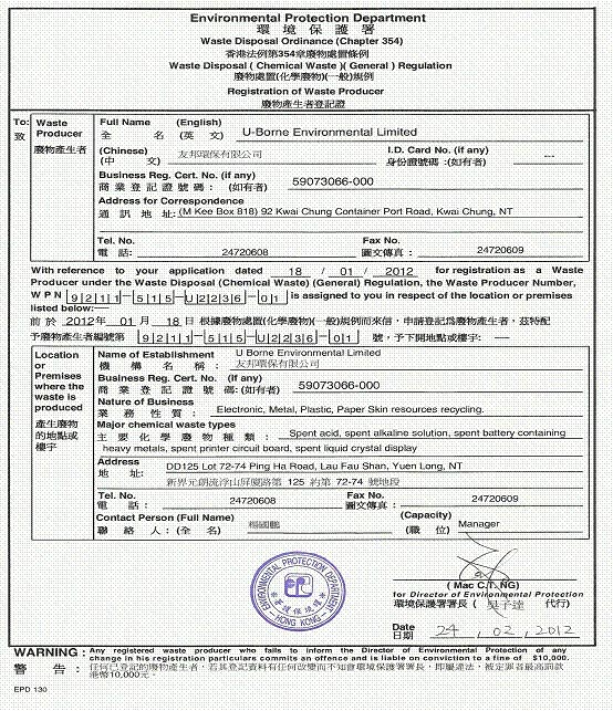 友邦-废物产生者登记证